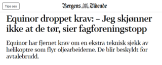 Det pågår en strid mellom Equinor og fagforeningene i Equinor (se Bergens tidende, betalingsmur) om behovet for en manuell sjekk av helikoptrene før avgang, dette gjelder de nye AW189 helikoptrene fra Leonardo som nylig er satt i drift på norsk sokkel. Equinor og Lufttransport ønsker ikke å gjennomføre disse sjekkene som gjennomføres visuelt med å åpne luker, slik både CHC og Bristow har gjort på sine helikoptre i mange år. Avtalebrudd, hevdes fra fagforeningene.